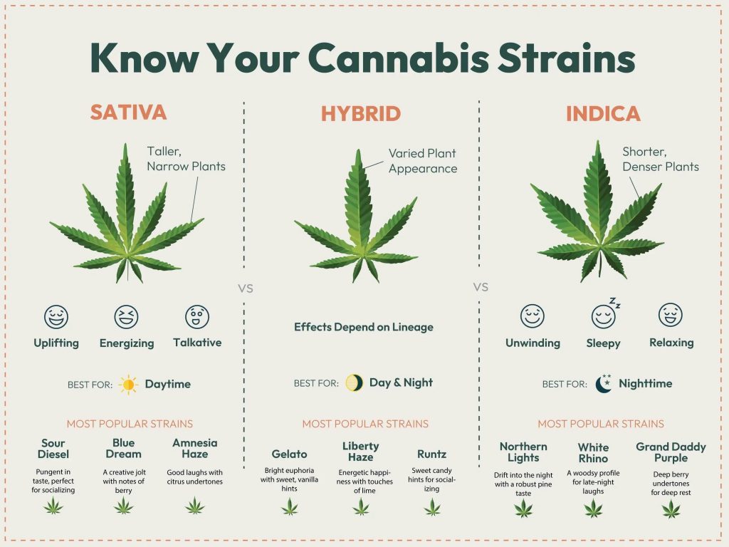 Indica strains are often associated with relaxing, body-heavy effects, while sativa strains are linked to uplifting, energetic experiences.