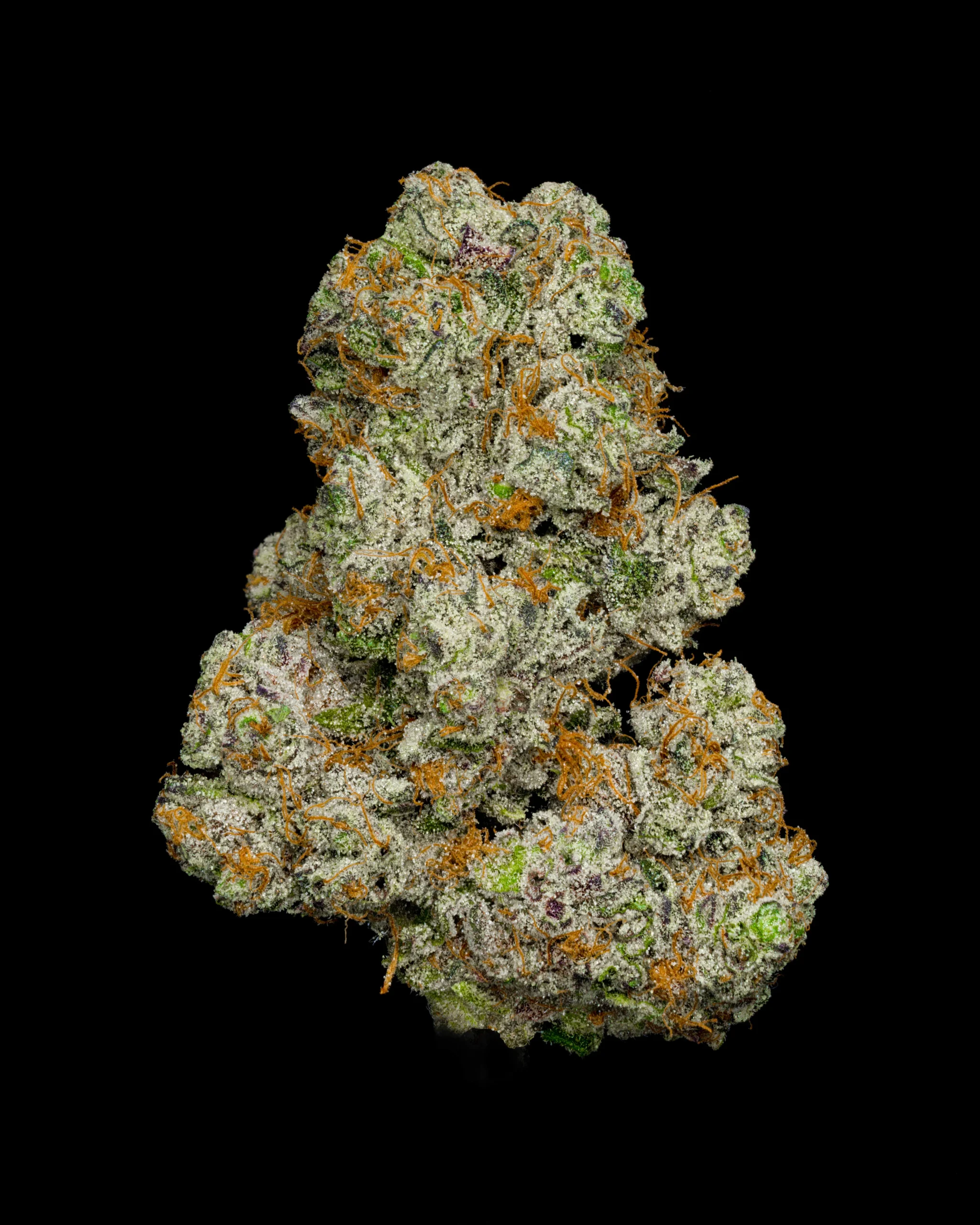 The buds are dense and beautifully frosted, featuring deep forest-green hues with purple streaks and fiery orange pistils. A thick coating of crystalline trichomes gives the flowers a sticky, sugar-dusted appearance — a visual hint at its potency and terpene richness.
