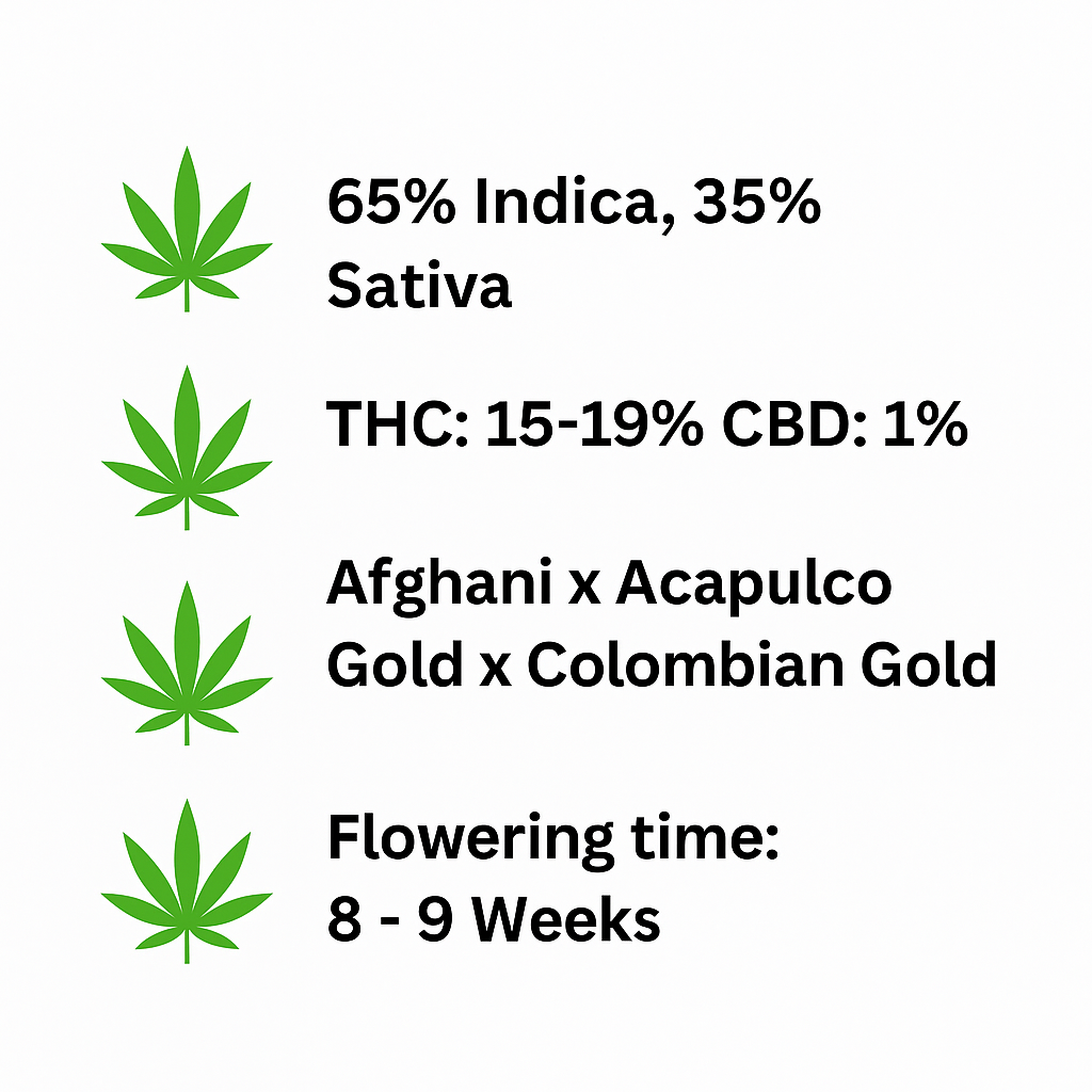 Genetics: Skunk #1 (a cross of Afghani, Acapulco Gold, and Colombian Gold)