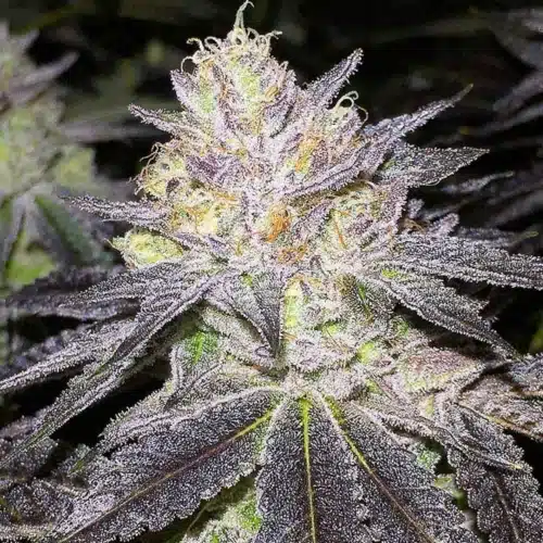 Wedding Cake’s buds are dense, chunky, and visually striking — often displaying deep green and purple hues coated in a thick layer of frosty white trichomes. The pistils are bright orange, adding contrast and giving each bud a “sugar-dusted” wedding dessert look that perfectly matches its name.